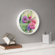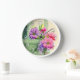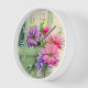 Arte de color acuático que representa flores rosas y violetas sentadas en un alféizar de ventana.