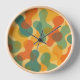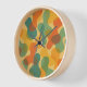 This contemporary clock design showcases a vibrant pattern of abstract geometric shapes, complemented by a striking color palette that includes teal, blue, green, orange, and yellow. Its ornate and eclectic style appeals to artistic fashionistas, trendsetters, and enthusiasts of vintage retro art, as well as those who appreciate abstract digital designs.
