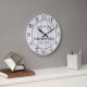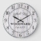 Un reloj de pared de boda rústico moderno de madera de granero blanqueado con fecha establecida y monograma en tablillas de madera.