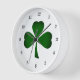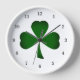 Reloj floral de Clover con un sencillo diseño de shamrock verde sobre un fondo blanco. Los números negros te dan el tiempo de darle un toque irlandés a tu decoración de casa.