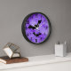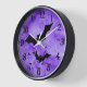 This is a design for the Halloween season with graphic black bats flying over a purple-grunge background. There is a clock face with black numbers encircled in a thin black ring. This design will create a unique holiday wall clock for your home or office.
