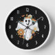 Un reloj con un ilustracion de un fantasma sonriente. Decorado con flores, arcos de lluvia y murciélagos.