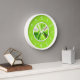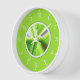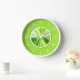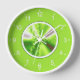 Este reloj redondo de pared presenta arte fractal abstracto en verde sobre un marco redondo blanco y un fondo verde lima con números blancos.