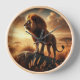 Ein majestätischer Löwe steht stolz auf einem Felsen inmitten der afrikanischen Savanne. Die Szene ist in warmes, goldenes Licht eines Sonnenauf- oder -untergangs getaucht, was die beeindruckende Mähne des Löwen hervorhebt. Im Hintergrund erstreckt sich die weite Natur mit hohen Gräsern, vereinzelten Akazienbäumen und sanften, fernen Hügeln. Der Himmel zeigt leichte Wolken, die der Szenerie eine zusätzliche Tiefe und Atmosphäre verleihen. Die Darstellung ist realistisch und detailreich, mit Fokus auf den Texturen des Fells und der Umgebung.