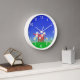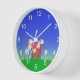 Reloj de pared con mi diseño original de una regadera roja y margaritas brillantes con un cielo azul y hierba verde.
