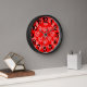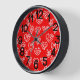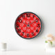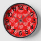 Este reloj de pared tiene un diseño moderno de mediados de siglo de San Valentín de máscaras blancas dispersas en un campo de rojo.