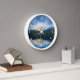 Un reloj con una hermosa foto de la naturaleza. Montañas en el fondo con un tranquilo lago en primer plano. Fotografía serena y relajante.