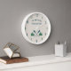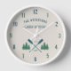 Un hermoso reloj de pared de temática rústica, con su nombre familiar y casa de lago, cabaña, cabaña u otro texto deseado y su fecha establecida, todo en tipografía de estilo rústico. Este diseño único y personalizado cuenta con verde azulados remos azules en barco, palmeras y pinos en un verde suave. El color crema de la base es fácilmente personalizable y combina con la decoración actual. Para ver más diseños como este, siéntase libre de visitar mi tienda aquí en "Zazzle.com/Rustic_Charm". ¡Gracias.