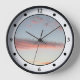 Nubes tenues con colores del atardecer, cielo azul pálido. Se asemeja a la vista a través de una escotilla. Numerales negros en negrita en 12, 3, 6 y 9, con puntos que marcan otros numerales.