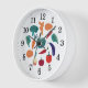Este reloj de pared presenta verduras coloridas.