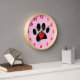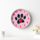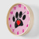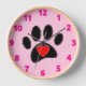 Huellas de garra de perro negro y dibujos de corazón rojo. Versión rosa de fondo. relojes de pared decorativos personalizados. Todo lo que se ve está impreso. No se usará ningún punto real en proceso. Una idea de regalo para las mujeres que aman a los perros.