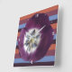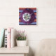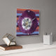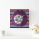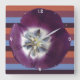 Flor púrpura de la flor del tulipán en un reloj de pared del fondo de las rayas.