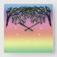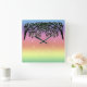 Árbol, de color negro con matiz de verde, que llega desde las esquinas superiores sobre los números blancos de la cara del reloj. El fondo está formado por colores rayados en el arcoiris que se sombrean a través del azul violeta, rosa, rojo, naranja, amarillo y verde, de arriba a abajo.