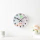 Este reloj de pared tiene un diseño Art Déco de líneas moradas, rosas, naranjas y azules.