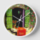 Pintura de una villa europea con persiana verde y rosas y una alfombra roja brillante.