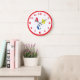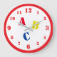 Design features the letters "ABC" in primary colors and large, stenciled font. Clock numbers are displayed in a blue, easy-to-read print. The 12, 3, 6 and 9 slightly larger than the rest of the numbers. Entire design is encircled in a red border. Also available in blue. Coordinates with the "Personalized Alphabet Nursery Collection."