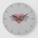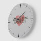 Un reloj de pared para amantes de los podcasts de crímenes reales en todas partes, con un patrón de corazones de huellas dactilares rojas y texto estilo máquina de escribir.