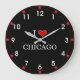 Me encanta el reloj de pared de Chicago. Letras blancas clásicas y corazón rojo sobre fondo negro.