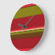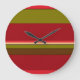 Este reloj de pared, sencillo pero decorativo, presenta un colorido patrón retro abstracto de rayas geométricas en colores rojo, naranja, marrón, verde oliva, negro y marrón.