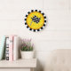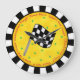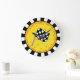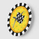 Este reloj de pared es genial para un motociclista o motociclista o alguien que ha ganado una carrera, menor o grande. Se personaliza con una bandera de cuadros en blanco y negro ondulante. La bandera está centrada en un fondo amarillo texturado y tiene un borde a cuadros negros y blancos. Personalizable completo para agregar texto para un nombre o fecha. Las palabras en rojo alinean el interior de la frontera y dicen "Ventilador de la raza", "Comienza la carrera y marca a cuadros". Las estrellas verdes están en el fondo. Este diseño es perfecto para los fanáticos específicos de los conductores no raciales y para múltiples formatos de tipo de raza. Personalizable completo para alguien que ama las carreras, ya sea automotriz, motocicleta, bicicleta o cualquier otra forma de carrera.