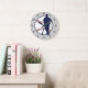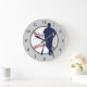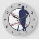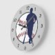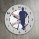 This is an attractive wall clock for that guy who is a true baseball fan. It features a blue baseball player and bat silhouette against a white ball image complete with red stitching. The image is placed on a light gray background. The black numbers make it easy to read.