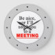 Sé amable o te enviaré a una reunión, alegre y divertida, diciendo a los asistentes y compañeros de trabajo en un reloj de pared con cara blanca y puntos negros para marcar las horas con fondo gris. Haga clic en Personalizar para agregar su nombre o mensaje, cambiar elementos, agregar su logotipo e incluso guardar su diseño para más adelante.
