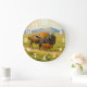 Wilderness wall clock captures a protective adult bison guiding its calf along a prairie trail, surrounded by golden grasses and distant mountains. White numerals on nature-toned backdrop create heartwarming wildlife charm—ideal for cabin decor or nature lover gifts.