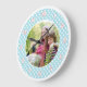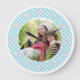 A personalized photo wall clock, with blue and white polka dot pattern, suitable for kids.