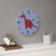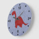 Reloj de pared divertida hecho con un aspecto de negrita de jean azul, con números y puntos negros. Gráficos de un dinosaurio de brontosaurio rojo decoran la mitad del reloj. Gran decoración de pared para cualquier habitación de niño, y hace una gran idea de regalo.