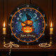 Deséenle a todos un "Happy Haunting" con este diseño redondo místico. Cuenta con un gato negro con ojos verdes brillantes encaramado sobre una pila de farolillos de jack-o' brillantes. La escena espeluznante incluye lunas en media luna, estrellas, murciélagos y hongos brillantes, todo ello dentro de un borde con temática de calabaza. Un acento perfecto de Halloween.