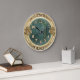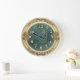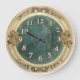 Reloj de pared de acrílico redondo de 10.75" con una imagen de jade verde en un marco dorado ornamentado con dos gorros dorados. Vea toda la colección Gemstones & Medallions Clock en la sección HOME.