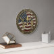 This magnificent round wall clock is a grand tribute to American history and faith, featuring a sophisticated 3D-style relief design. The clock face showcases the iconic Statue of Liberty, the Liberty Bell, and a soaring bald eagle set against the backdrop of the American flag. Centered in the composition is a radiant golden cross, symbolizing the nation spiritual heritage. Bold metallic text arches across the top reading "Celebrating America," while the bottom commemorates the historic milestone with "1776 – 2026" and "250 Years." The design is encased in an ornate, weathered bronze-style frame adorned with stars and delicate floral filigree. This functional home decor piece is a prestigious gift for veterans, history enthusiasts, and patriots. Its intricate sculptural detail and classic metallic tones make it a meaningful focal point for any home or office gallery wall.