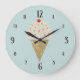 Este reloj de pared hermoso ofrece un suave, fondo coloreado azul con una imagen de un cono de helado del diseño del purpurina. La pieza del cono está en un diseño del purpurina del oro, la cucharada del helado es un diseño de marfil del purpurina con purpurina del oro asperja, y la cereza es purpurina rojo.