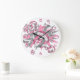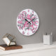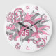 Este bonito reloj de voleibol en la pared presenta una "explosión" de baloncesto rosa, gris y blanco de tamaño variado y de estrellas rosas, grises y blancas con números de cara de reloj sobreyacentes - los paneles rosados y grises de las bolas de voleibol se mezclan con un patrón kaleidoscópico floral y ondulante - personalizar con el nombre del atleta y número de camiseta - por katz_d_zynes