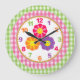 Un reloj con encanto que se puede ver con orgullo en cualquier habitación de chica. El espacio exterior del reloj está hecho en gingham rosa y lime. La cara interior, con sus bonitas flores de carita sonriente, está bordeada por colores coordinados con marcadores de minuto. Los números son brillantes y audaces -y también se hacen en colores coordinados.