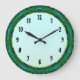 Este elegante e interesante reloj de pared presenta un dramático marco abstracto circular de curvas verdes, azules, índigo y amarillas alrededor de un centro turquesa pálido. Los números se pueden borrar si se prefiere un diseño más sencillo. Este patrón funciona mejor en los relojes circulares.