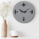 This design features a variety of black airplane silhouettes on the main clock numbers (12, 3, 6, 9). At the center of the watch is a black silhouette of an airplane propeller. Make a great birthday, anniversary or just because present for pilots and aviation lovers. Embrace the spirit of aviation on your wall and let every glance remind you of the skies.