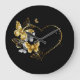 Marco dorado en forma de corazón, decorado con oro, joyas y mariposas blancas sobre fondo negro.
