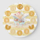 Hermoso ilustracion de un adorable hada bebé dentro de una taza con fresas. El fondo está decorado con rayas acuáticas amarillas y blancas y un purpurina dorado brillante. Las horas de reloj forman una encantadora paleta de colores dorados (puedes cambiar esos colores haciendo clic en el personalizar más adelante). El nombre del niño está escrito a mano.