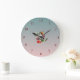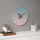 Reloj de cocina de bonito con fondo pastel de verde y rosa, con diseño de verduras en el centro. Los números rojos oscuros completan este diseño simplista.