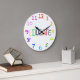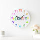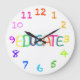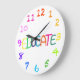 A cute wall clock featuring a photograph of "EDUCATE written in children's modeling clay with rainbow-colored chalk numbering. Photograph copyright © 2006 Karin Hildebrand Lau. Clock face design copyright © 2012 Karin Hildebrand Lau.