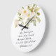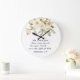 Reloj de pared con escritura cristiana inspiradora de cita representa una hermosa acuarela floral con flores blancas simples y vegetación. Presenta un poderoso Verso de la Biblia de Efesios 2:8, "Por gracia te han salvado, a través de la Fe, ... es el regalo de Dios".