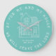 Un encantador reloj familiar en un moderno diseño escandinavo de estilo hígge. El diseño presenta un ilustracion de mano de una casa blanca, con el popular verso de la Biblia "en cuanto a mí y a mi casa, serviremos al Señor" Joshua 24:15 alrededor del perímetro del reloj con letras a mano blanca, personalizadas con tu apellido y año establecido, en un fondo verde azulado. La cita y el color de fondo son editables. Hace un nuevo regalo de cierre de casa o inmueble.