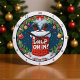 Se trata de un alegre diseño gráfico circular para la temporada de vacaciones. La imagen central muestra las piernas de Santa y las botas negras pegadas cómicamente a una chimenea de ladrillo rojo en un techo nevado. El texto "DROP ON IN!" aparece de forma destacada en la chimenea en letras en negrita y blancas. El conjunto está enmarcado por una corona verde festiva decorada con bayas rojas y un arco rojo. El fondo es un cielo nocturno azul oscuro con estrellas que le confieren un ambiente acogedor y cálido.