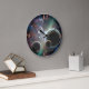 Great for outer space lovers or geeks. A colorful fictional outer space scene wall clock. Features planets and flares. You can add text to customize this design. To add text the same orange color as the numbers, use hex code d58270.