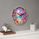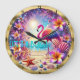 Este reloj circular representa una escena de playa vibrante y de ensueño. Un flamenco colorido se alza sobre una orilla de arena adornada con conchas y una estrella de mar. El fondo está formado por un cielo luminoso con chispas de fuegos artificiales y flores tropicales exuberantes en diferentes tonalidades de rosa, púrpura y amarillo. El texto "LIFE'S A BEACH Enjoy the Waves" está sutilmente integrado en el diseño. El reloj está encajado en un marco dorado y con cinta adhesiva.