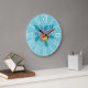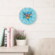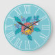 Reloj floral de arte folclórico noruego con números blancos y fondo azul cielo.