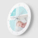 Recuerde el nacimiento de su recién nacido con el reloj de pared del patrón de gingham azul dulce de la diagonal de agua con números. Personalice agregando una foto, nombre y fecha de nacimiento de su bebé.