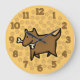 Cheerful and bright wall decor for a dog lover's home. Mellow orange colored dog wall clock with large 12 hour numbers. The clock is decorated with a cartoon of a dog carrying a bone with paw prints as a background. Great for adding a splash of color and joy to your home.