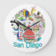 Tanto por ver y por hacer en la ciudad de la playa de San Diego. San Diego se representa a través de una caprichosa colección de monumentos y atracciones icónicas, incluyendo vida silvestre, arquitectura y parques de diversiones. Los colores brillantes y los diseños lúdicos transmiten la vibrante y diversa oferta de la ciudad.